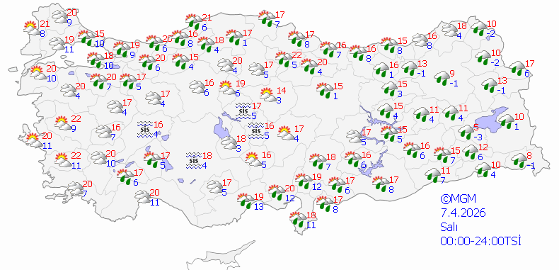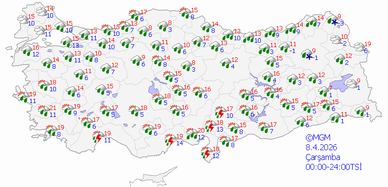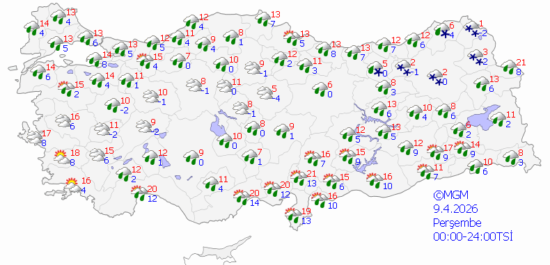 Ülke genelininin çok bulutlu, Ege, Akdeniz, İç Anadolu, Karadeniz (Zonguldak hariç), Doğu ve Güneydoğu Anadolu bölgesi ile Balıkesir’in doğusu, Sakarya, Bursa ve Bilecik çevrelerinin yağışlı geçeceği tahmin ediliyor. Yağışların; genellikle yağmur ve sağanak, Ege ve Akdeniz kıyıları ile Güneydoğu Anadolu’nun yer yer gök gürültülü sağanak, Doğu Anadolu’nun kuzeydoğusunun yükseklerinde karla karışık yağmur ve yer yer kar şeklinde olması bekleniyor. Doğu Karadeniz’in iç kesimleri ile Doğu Anadolu’da yüksek kar örtüsüne sahip eğimli alanlarda çığ ve kar erimesi tehlikesi bulunmaktadır.